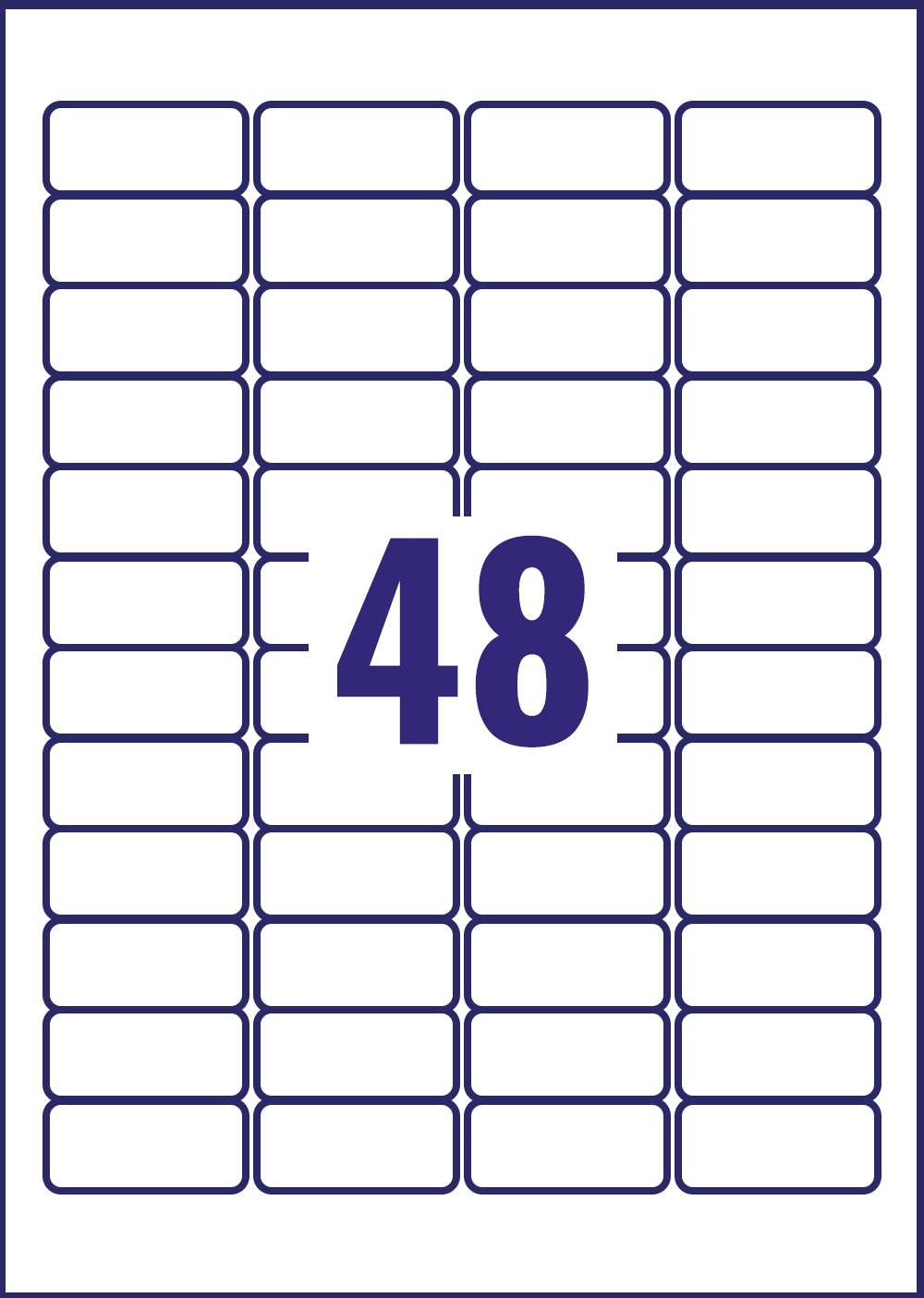 Available in 48 white labels per sheet in a format of 45.7 x 21.2mm, the bright white material gives a sharp print finish. Suitable for all popular black and white laser, colour laser and inkjet printers, also for copiers.