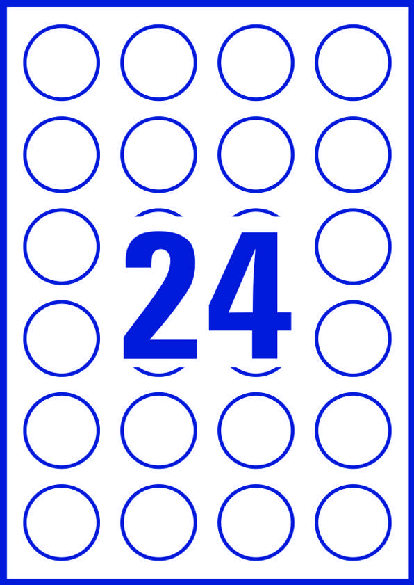 These round labels are 37mm diameter in size and there are 24 on each printable sheet. With 25 sheets in a pack, that's 600 labels in total. Ideal for folders, documents, jars, bottles, gifts, packaging, stickers, brochures...