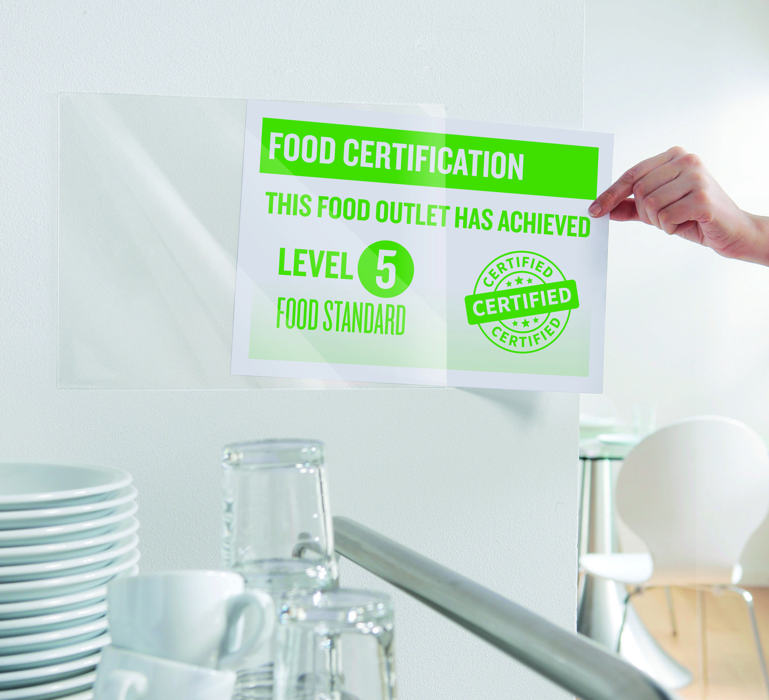 Peel off the backing paper and stick it on a smooth surface. Then simply slip your A4 sheets in and out when you want to update. No need to laminate your signs, or hunt around for sticky tack or glue. The adhesive backing is safe for all surfaces and is removable without residue. Ideal for regularly updated information, eg. Food safety certification, for weekly menus, rotas or messages.