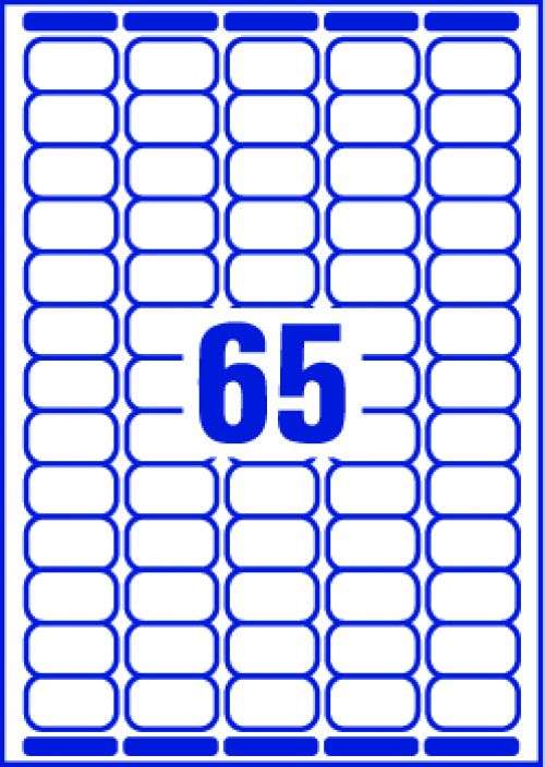 The label format is 38.1 x 21.2mm with 65 labels per sheet.