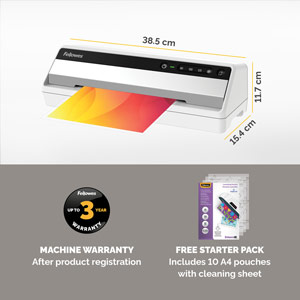 INCLUDES STARTER KIT - Your Fellowes A4 laminator includes a starter pack of a cleaning sheet and 10 Fellowes laminating pouches, ensuring a professional finish for your laminated documents