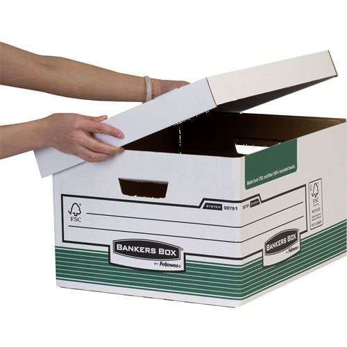 Bankers Box™ by Fellowes Storage Box is an extra strength large storage box with double wall construction to end panels and base. Comes with quick and easy FastFold™ automatic assembly which means this box can be set up 4 times faster than manual boxes; saving you time. Up to 50% stronger than a basic strength box this durable box can accommodate 3 x System 120mm transfer files and can be stacked up to 4 units high. It is made from FSC™ certified board and is 100% recyclable. Ideal for use with or without shelving units when you require infrequent access to files. This storage box would be perfect if you need to transport files from the office to the home. All inks used are water based and all adhesives are solvent free. The System range offers a simple and effective total document management system. Whether it is for use in the office or the home office the System range provides an integrated storage solution for all your business filing and storage needs. This modular system consists of space optimising products for all stages of the document lifecycle, from establishing a filing system to long-term document archiving and storage.