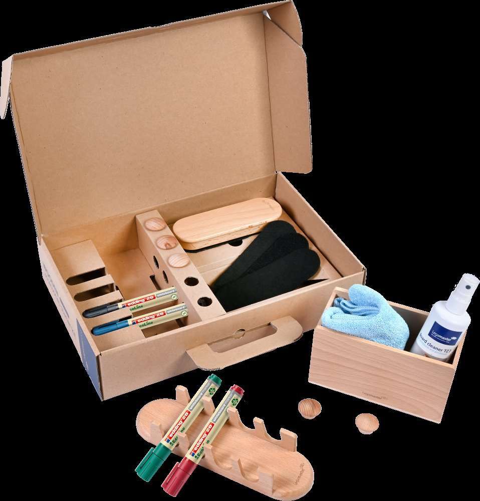 All of the tools included in the set are appropriate for use on magnetic whiteboard surfaces. The wooden parts of the tools are made of beech wood, specifically fagus sylvatica, and are finished with varnish. As each wooden item is made of natural wood, they are unique in both colour and appearance. Additionally, the refillable markers that come with the set are climate-neutral, as they are made of 90% recyclable materials. Furthermore, 83% of the materials used to create the markers are post-consumer plastic, such as used yogurt cups or watering cans.
