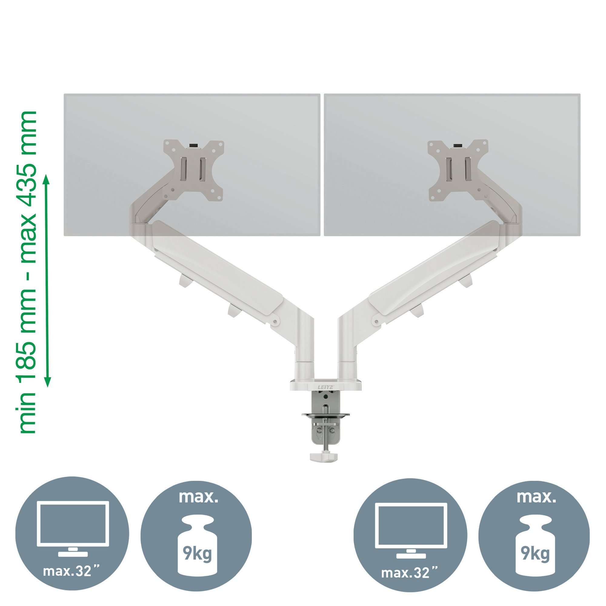 The Leitz Space Saving Dual Monitor Arm has a positive impact on posture, promotes proper eye alignment and supports neck and shoulder comfort when the height of the monitors are adjusted correctly, and as recommended, to the ideal ergonomic position.